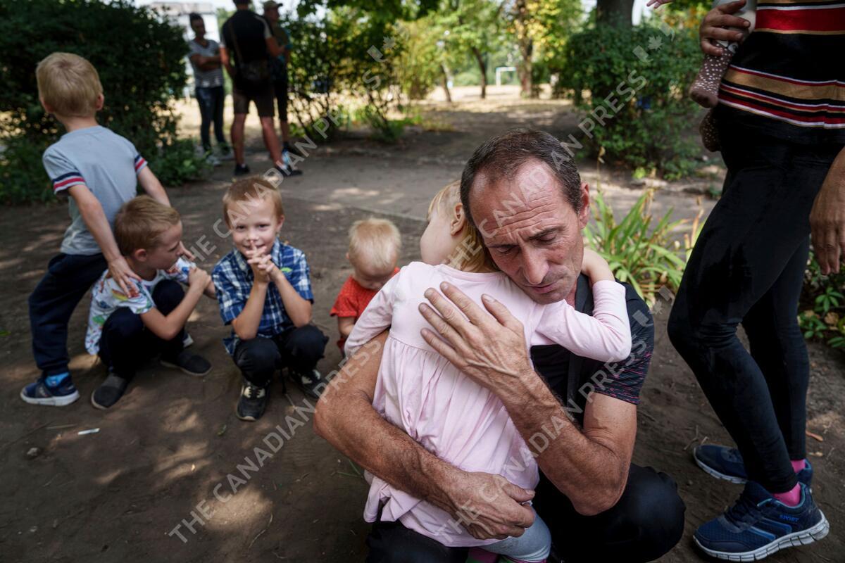 A father hugs his daughter, with his other children nearby, as the family waits to be evacuated in Pokrovsk, Donetsk region, Ukraine, Aug. 23, 2024. (AP Photo/Evgeniy Maloletka)