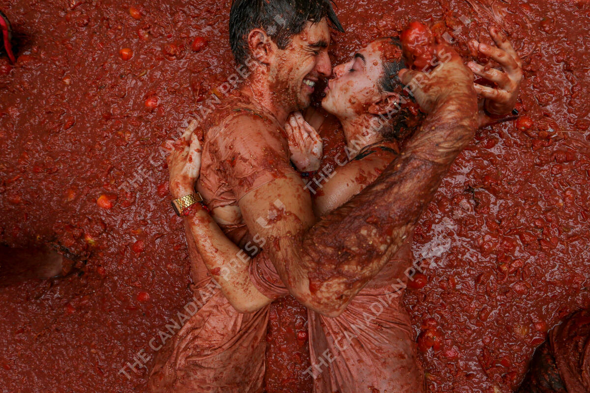 Revelers embrace in a pool of squashed tomatoes during the annual "Tomatina" tomato fight fiesta, in Bunol, Spain, Aug. 28, 2024. (AP Photo/Alberto Saiz)