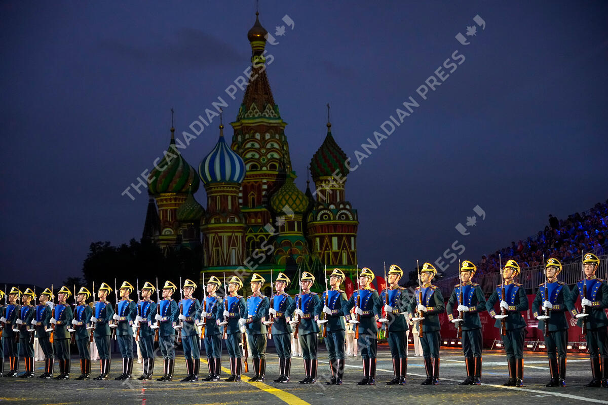 Presidential regiment soldiers perform during the Spasskaya Tower International Military Music Festival in Red Square, backdropped by the St. Basil Cathedral, in Moscow, Aug. 23, 2024. (AP Photo/Alexander Zemlianichenko)
