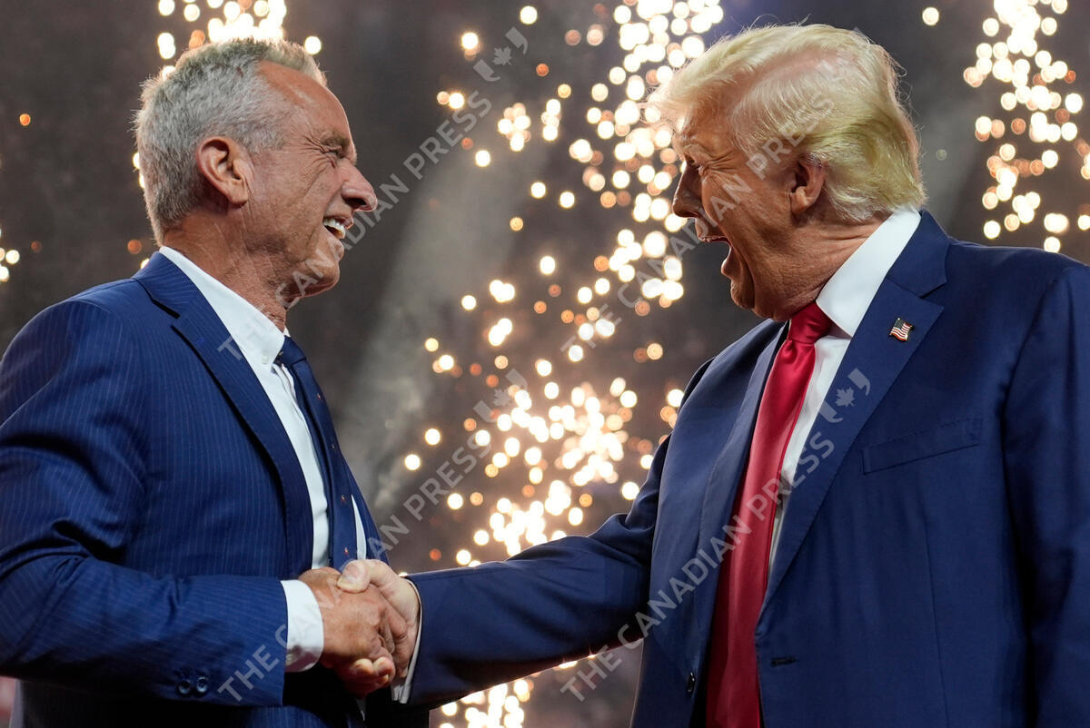 Robert F. Kennedy Jr., who earlier in the day suspended his independent campaign for the White House and endorsed Donald Trump, shakes his hand at a campaign rally in Glendale, Ariz., Aug. 23, 2024. (AP Photo/Evan Vucci)