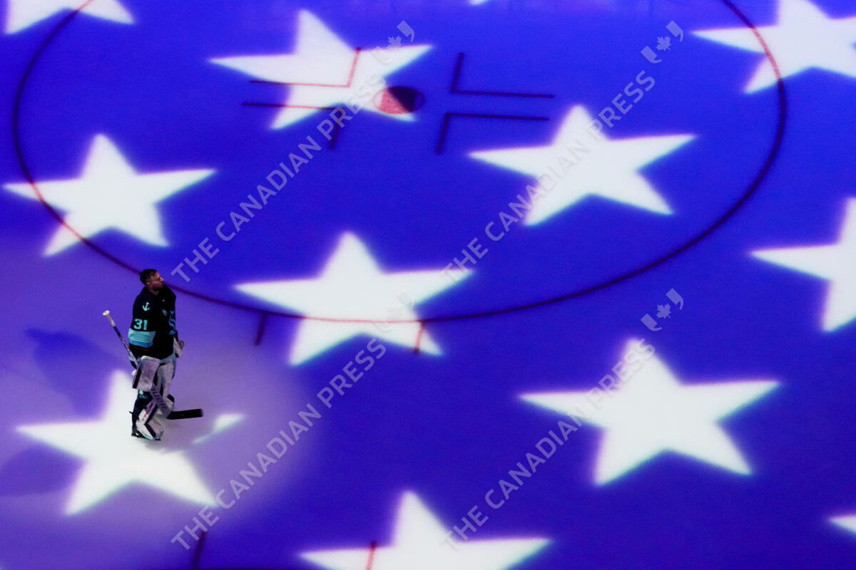 Seattle Kraken goaltender Philipp Grubauer stands on the ice as a projection of the American flag is shown during the national anthem before facing the Arizona Coyotes in an NHL hockey game Tuesday, April 9, 2024, in Seattle. (AP Photo/Lindsey Wasson)