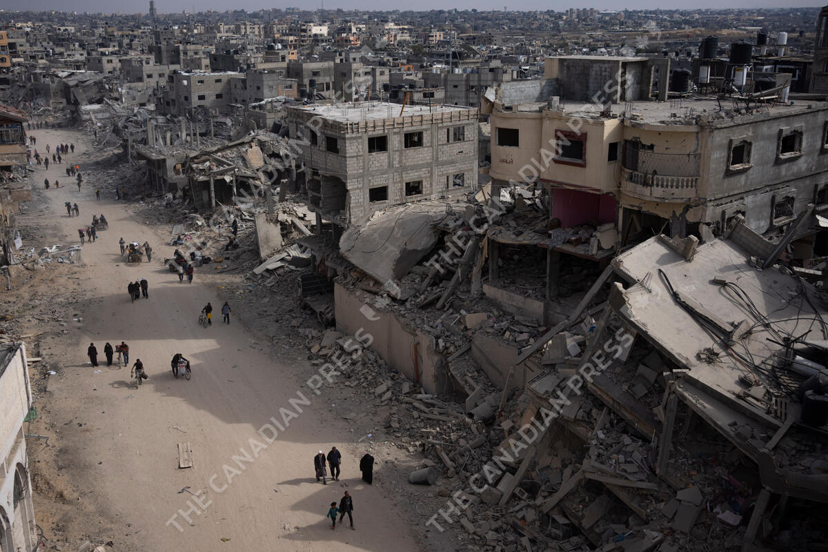 Palestinians walk through the destruction in the wake of an Israeli air and ground offensive in Khan Younis, southern Gaza Strip, Monday, April 8, 2024. Israel says it has withdrawn its last ground troops from the city, ending a four-month operation. (AP Photo/Fatima Shbair)