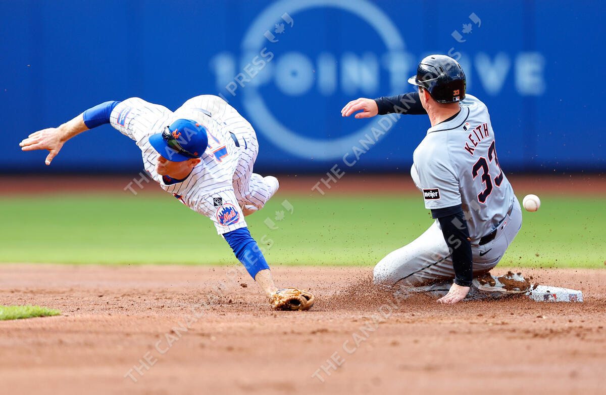 Detroit Tigers Colt Keith (33) steals second base as New York Mets shortstop Joey Wendle, left, is unable to handle the throw during the second inning in the second baseball game of a doubleheader, Thursday, April 4, 2024, in New York. (AP Photo/Noah K. Murray)