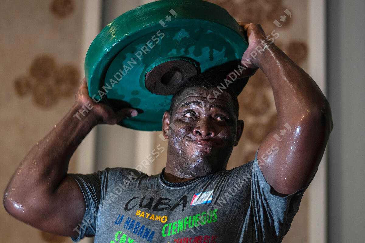 Greco-Roman wrestler Cuba's Mijain Lopez Nunez lifts weights during a training session in Varadero, Cuba, Wednesday, April 3, 2024. Lopez will be part of the Cuban delegation to Paris in pursuit of a fifth Olympic gold to mark the end of his career. (AP Photo/Ramon Espinosa)