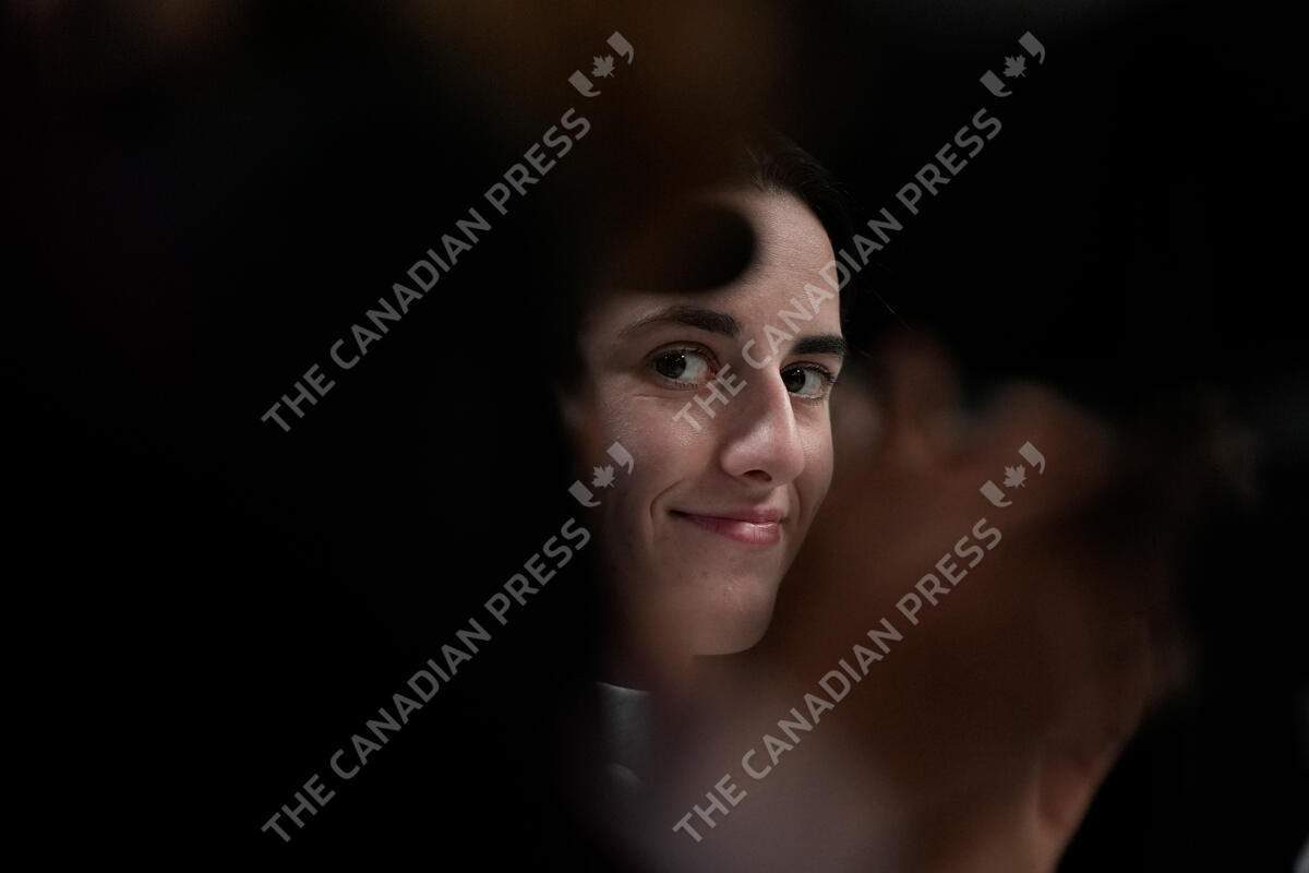 Iowa's Caitlin Clark smiles during a news conference announcing the Associated Press NCAA Women's Coach and Player of the Year, in Cleveland, April 4, 2024. The star guard from Iowa was named AP's Player of the Year in women’s basketball for the second consecutive year. (AP Photo/Carolyn Kaster)