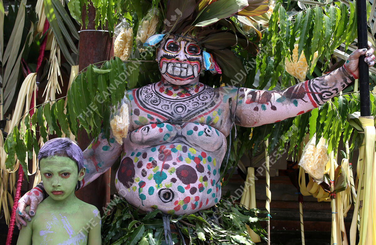 Gede Pasek and his son participate in the Hindu ritual Ngerebeg at Tegallalang village in Bali, Indonesia, April 3, 2024. In this ritual, participants paint their bodies with colorful paint and parade around their village to ward off evil spirits and bring happiness to the village. (AP Photo/Firdia Lisnawati)