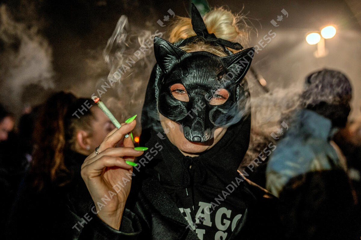A masked woman eyes the camera while holding a marijuana cigarette during a 'Smoke-In' event on the day cannabis for personal use was legalized, in Berlin, Germany, April 1, 2024. As per the new law, adults aged 18 and over will be allowed to carry up to 25 grams of cannabis for their own consumption. (AP Photo/Ebrahim Noroozi)