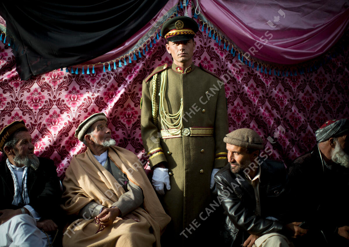 FILE - An honor guard stands next to men who arrived to mourn the death of late Vice President Field Marshal Mohammed Qasim Fahim outside his house in Kabul, Afghanistan, Monday, March 10, 2014. The influential vice president, a leading commander in the alliance that fought the Taliban who was later accused with other warlords of targeting civilian areas during the country's civil war, died March 9, 2014. He was 57. (AP Photo/Anja Niedringhaus, File)