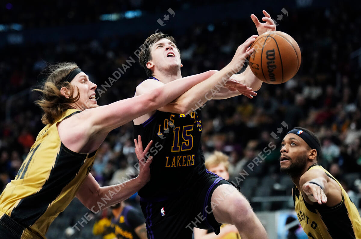 Toronto Raptors forward Kelly Olynyk (left) knocks the ball away from Los Angeles Lakers guard Austin Reaves (15) as Raptors forward Bruce Brown (right) looks on during second half NBA basketball action in Toronto on Tuesday, April 2, 2024. THE CANADIAN PRESS/Frank Gunn
