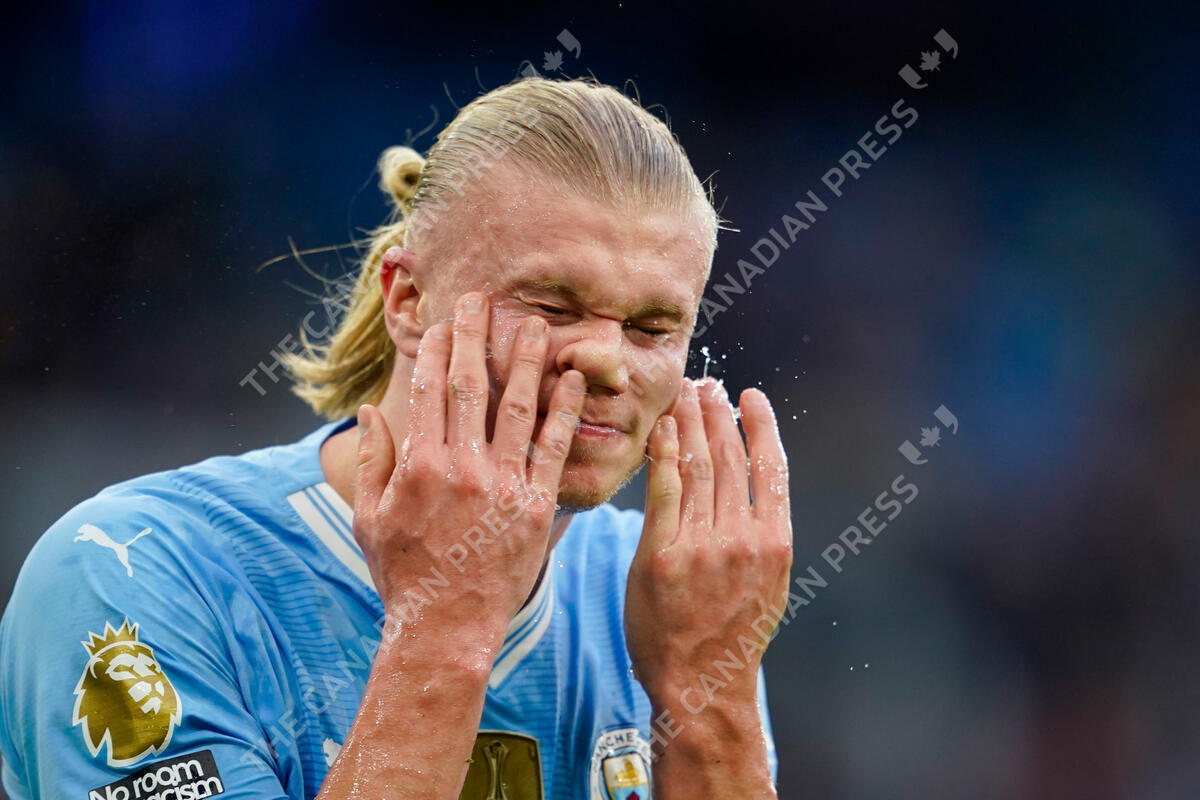 Manchester City's Erling Haaland refreshes himself during the English Premier League soccer match between Manchester City and Arsenal at the Etihad stadium in Manchester, England, Sunday, March 31, 2024. (AP Photo/Dave Thompson)