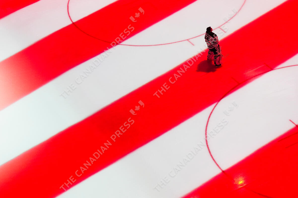 Dallas Stars goaltender Jake Oettinger stands in a projection of the American flag during the national anthem before an NHL hockey game against the Seattle Kraken, Saturday, March 30, 2024, in Seattle. (AP Photo/Lindsey Wasson)