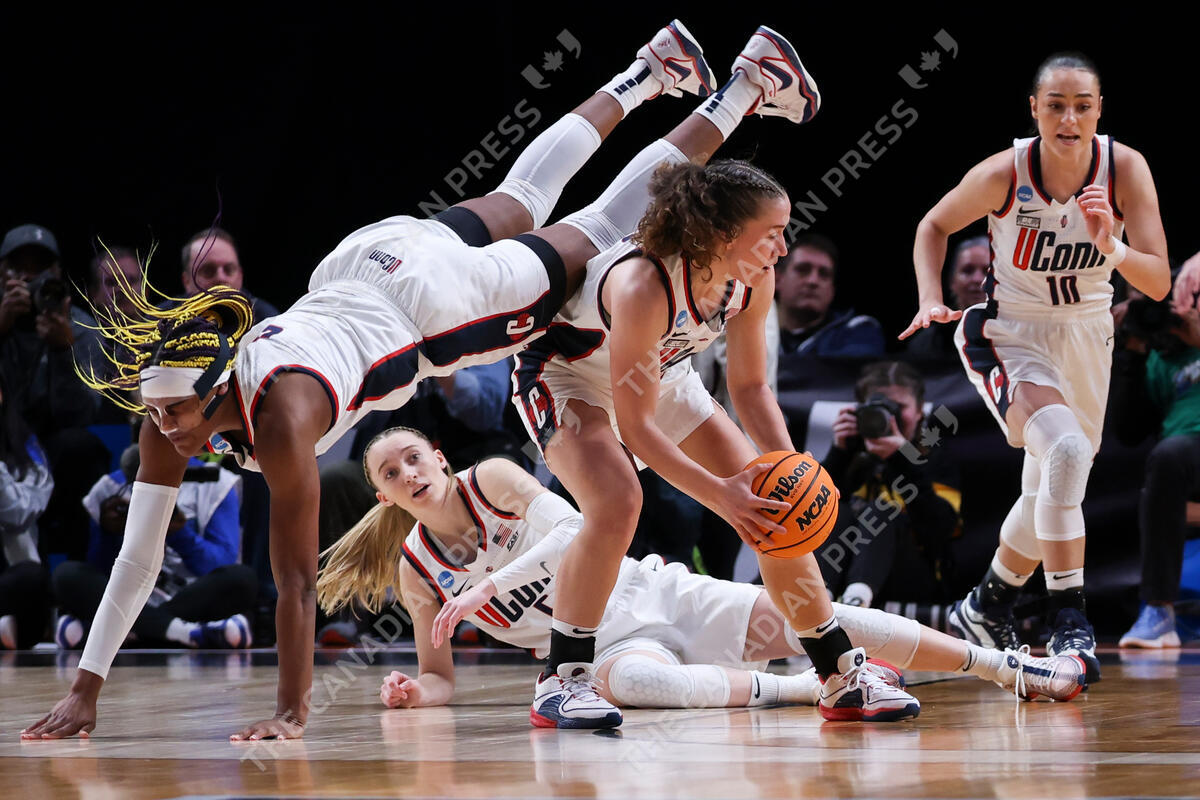 UConn forward Aaliyah Edwards, left, dives over UConn guard Ashlynn Shade during the first half of the team's Sweet 16 college basketball game against Duke in the women's NCAA Tournament, Saturday, March 30, 2024, in Portland, Ore. (AP Photo/Howard Lao)