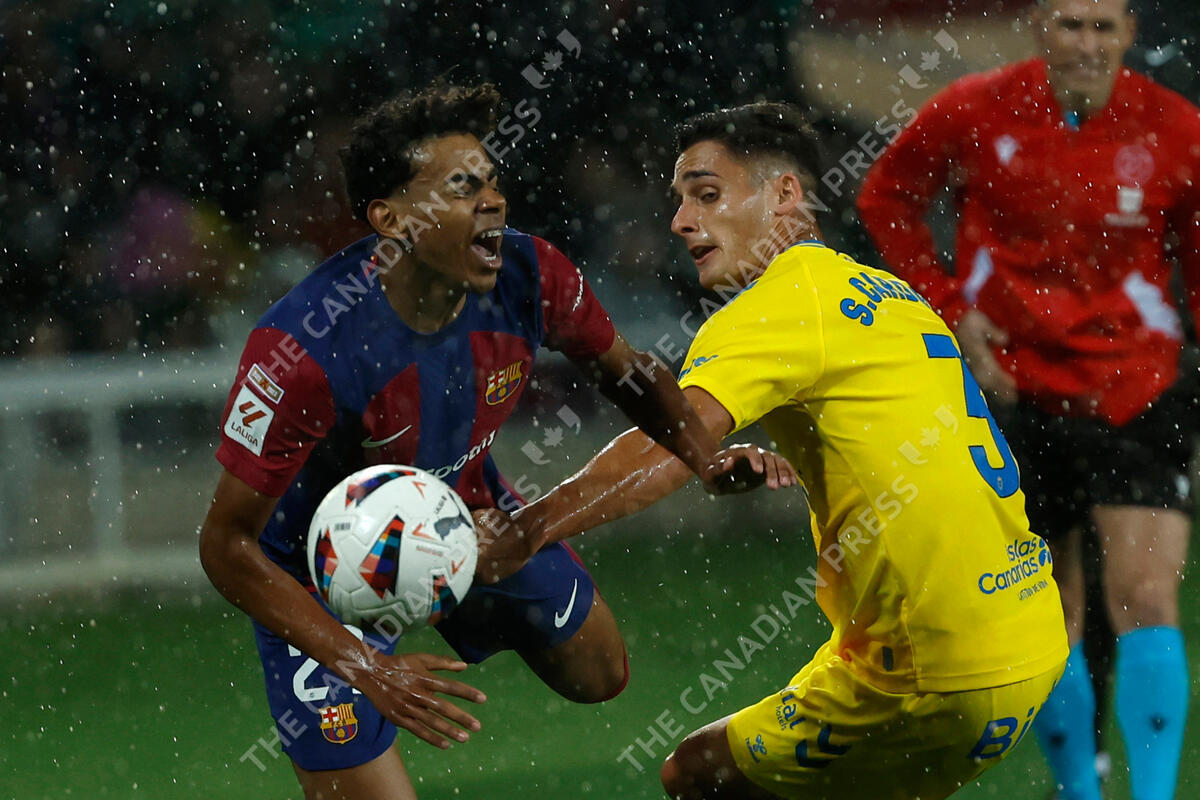 Barcelona's Lamine Yamal, left, is fouled by Las Palmas' Sergi Cardona during a Spanish La Liga soccer match between Barcelona and Las Palmas at the Olimpic Lluis Companys stadium in Barcelona, Spain, Saturday, March 30, 2024. (AP Photo/Joan Monfort)