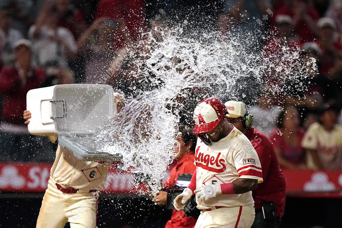 Los Angeles Angels' Willie Calhoun, is hit with water by Anthony Rendon as he scores after hitting a walk-off two-run home run during the 10th inning of a baseball game against the Seattle Mariners Friday, July 12, 2024, in Anaheim, Calif. (AP Photo/Mark J. Terrill)