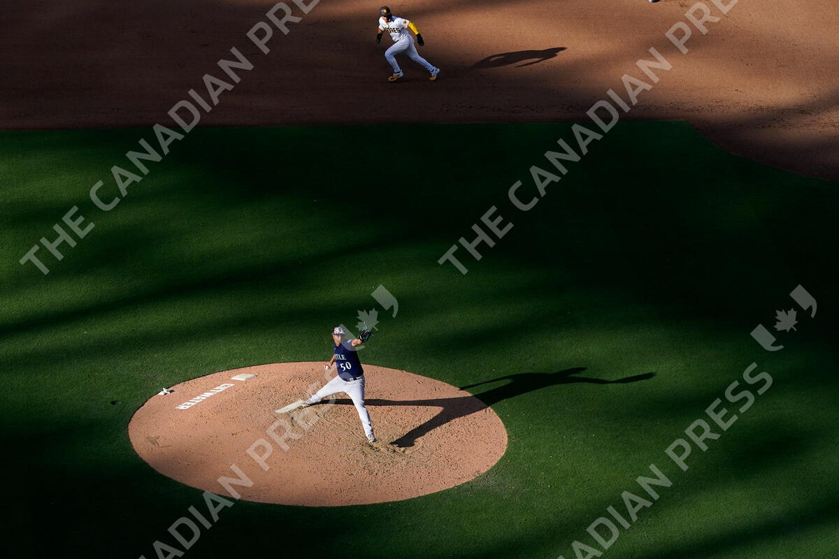 Seattle Mariners relief pitcher Erik Swanson works against a San Diego Padres batter as San Diego Padres' Ha-Seong Kim leads off from first base, above, during the seventh inning of a baseball game Monday, July 4, 2022, in San Diego. (AP Photo/Gregory Bull)