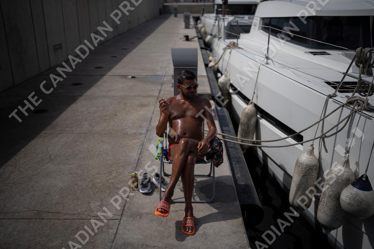 A man sunbathes during a heat wave in Marseille, southern France, Wednesday, June 15, 2022. (AP Photo/Daniel Cole)