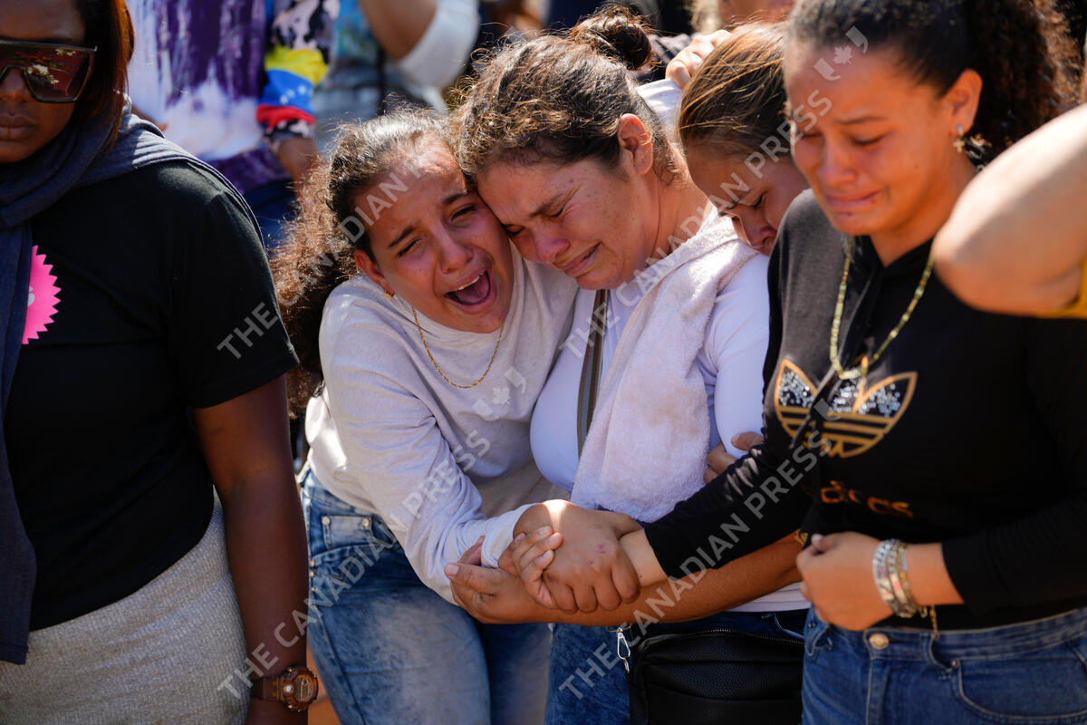 A sister of miner Santiago Mora, left, cries with other relatives as he is buried at the cemetery in La Paragua, Bolivar state, Venezuela, Thursday, Feb. 22, 2024. The collapse of an illegally operated open-pit gold mine in central Venezuela killed at least 14 people and injured several more, state authorities said Wednesday, as some other officials reported an undetermined number of people could be trapped. (AP Photo/Ariana Cubillos)