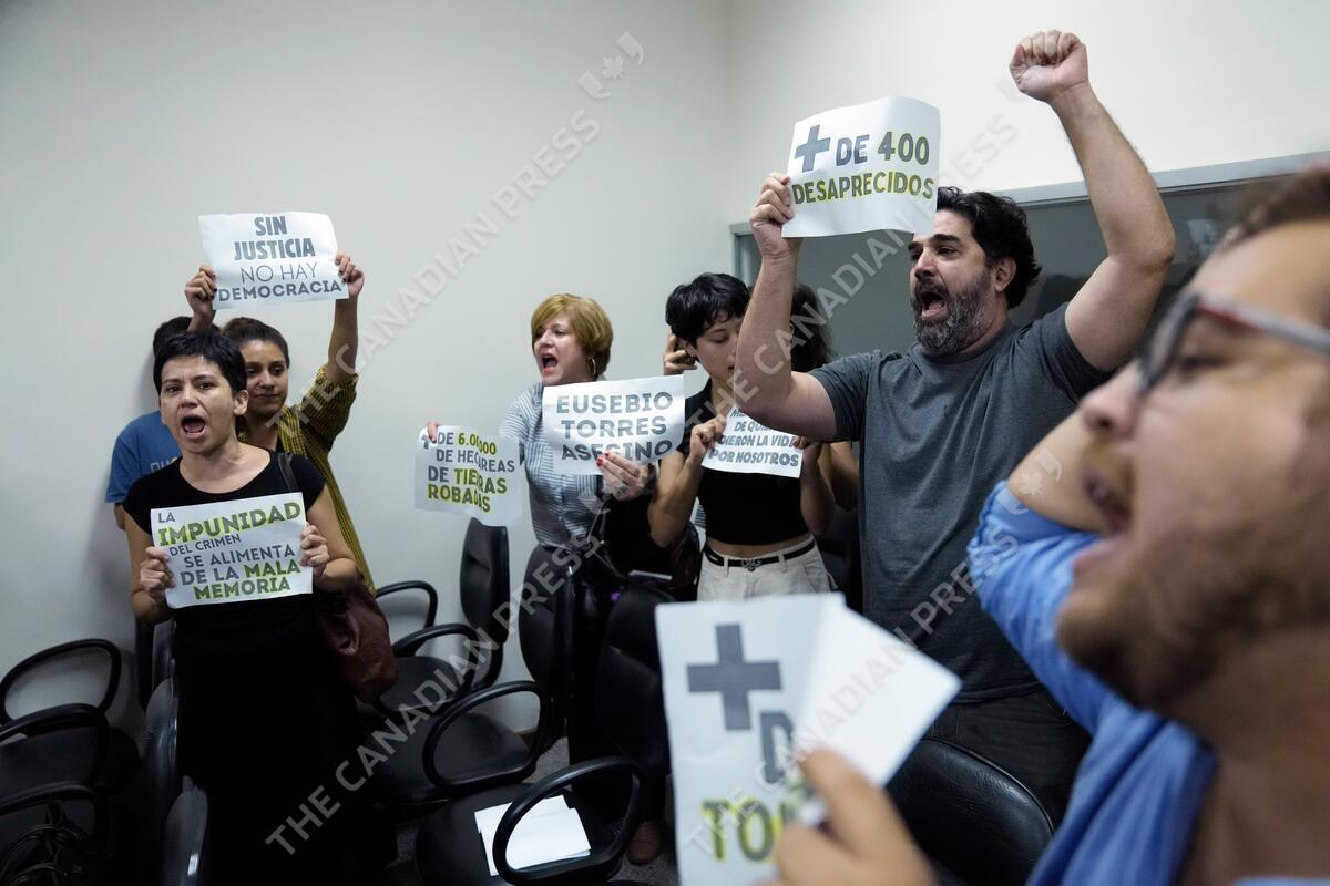 Political and human rights activists who are former detainees react as the court announces the 30-year prison sentence for retired Police Commissioner Eusebio Torres for the 1976 torture of detainees during the Stroessner dictatorship, at Justice Palace in Asuncion, Paraguay, Tuesday, Feb. 20, 2024. Torres, 88, will serve his sentence at home. The signs read in Spanish "More than 400 disappeared," "Without justice there is no democracy," and "Impunity for crime feeds a bad memory." (AP Photo/Jorge Saenz)