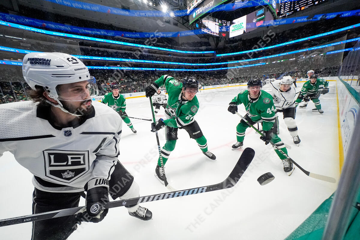 Los Angeles Kings center Phillip Danault, left, tries to control the puck against Dallas Stars center Roope Hintz, center, and defenseman Joel Hanley (44) during the second period of an NHL hockey game, Tuesday, Jan. 16, 2024, in Dallas. (AP Photo/Julio Cortez)
