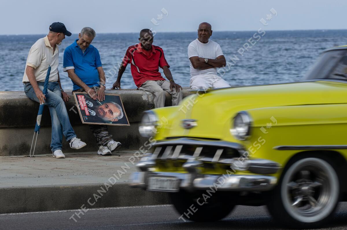 People sit on the malecon with an image of Fidel Castro as they wait for the arrival of the parade of the 65th anniversary of the arrival of Fidel Castro to the capital as head of the rebel Army in Havana, Cuba, Monday, Jan. 8, 2024. (AP Photo/Ramon Espinosa)