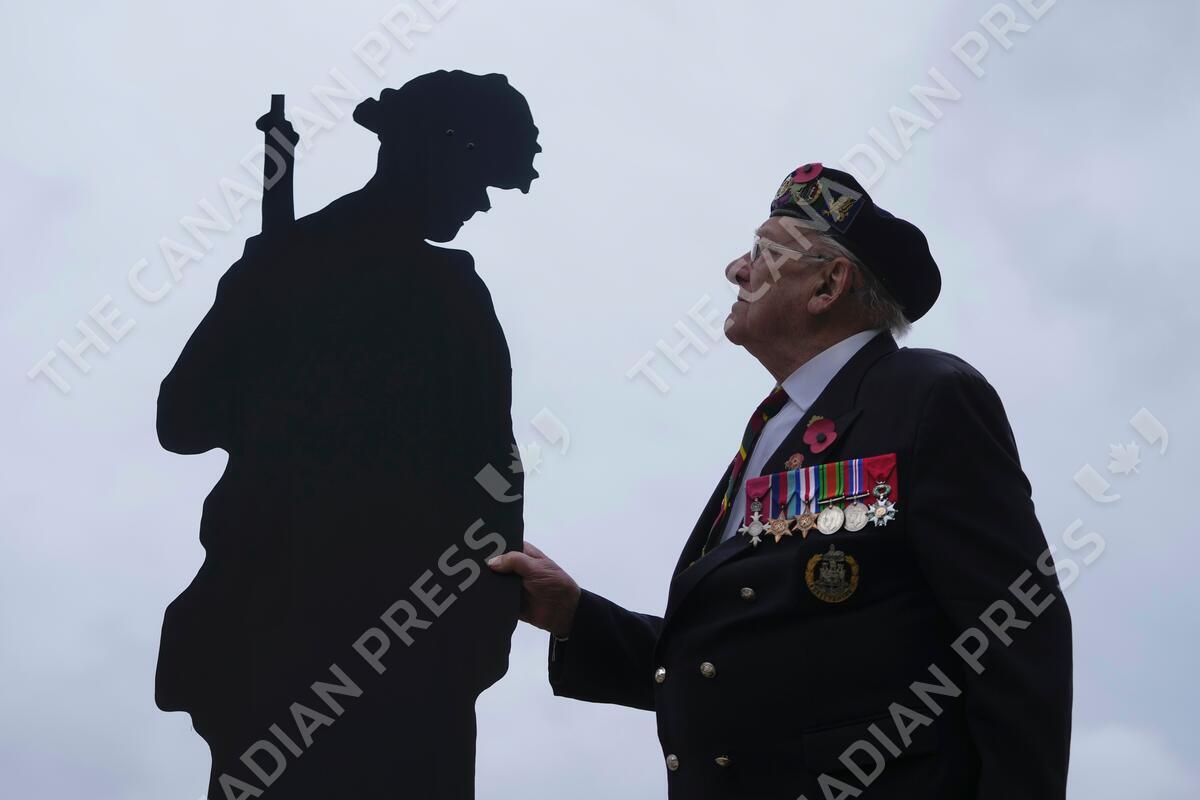 Normandy Veteran Ken Hay MBE, poses with an art installation of life-sized servicemen silhouettes by community project 'Standing with Giants' ahead of the Remembrance Day, at Kensington Gardens in London, Thursday, Nov. 9, 2023 to pay tribute to all those who have lost their lives in service for the country. (AP Photo/Kin Cheung)
