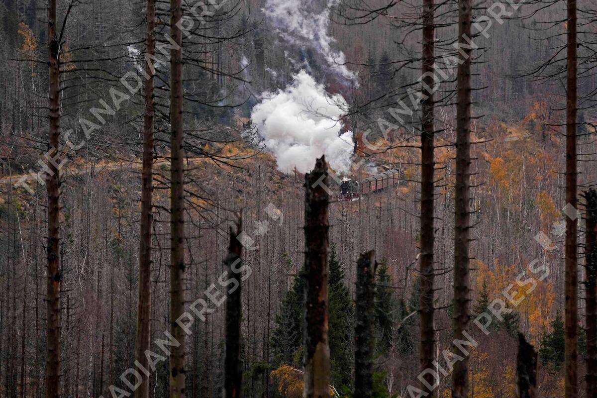 A steam train drives through the autumnal colors 'Harz' forest passing trees damaged by the bark beetle, at the 1,142-meter (3,743 feet) high Brocken mountain near Schierke, Germany, Monday, Nov. 6, 2023. (AP Photo/Matthias Schrader)