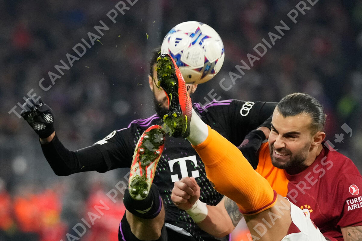Bayern's Noussair Mazraoui, left, and Galatasaray's Abdulkerim Bardakci challenge for the ball during the Champions League group A soccer match between Bayer Munich and Galatasaray at the Allianz Arena stadium in Munich, Germany, Wednesday, Nov. 8, 2023. (AP Photo/Matthias Schrader)