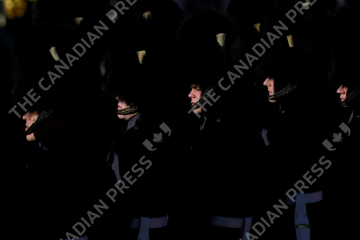 Soldiers march in front of Buckingham Palace ahead of the State Opening of Parliament at the Palace of Westminster in London, Tuesday, Nov. 7, 2023. King Charles III will sit on a gilded throne and read out the King's Speech, a list of planned laws drawn up by the Conservative government and aimed at winning over voters ahead of an election next year. (AP Photo/Kin Cheung)