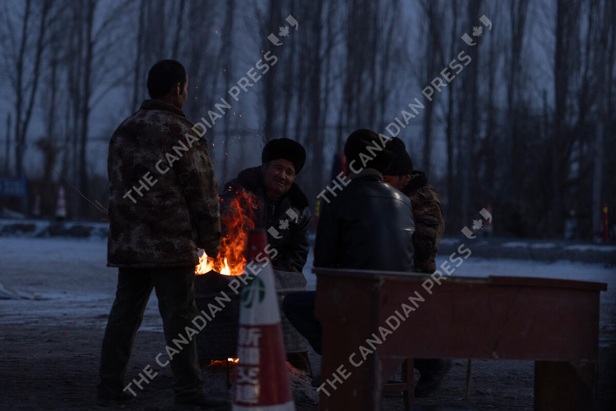 Men gather near a fire at a checkpoint into Wushi county in China's western Xinjiang region on Tuesday, Jan. 23, 2024. A massive earthquake has struck a sparsely populated part of China's western Xinjiang region, killing a few and damaging or collapsing more than 120 homes in freezing cold weather. (AP Photo/Ng Han Guan)