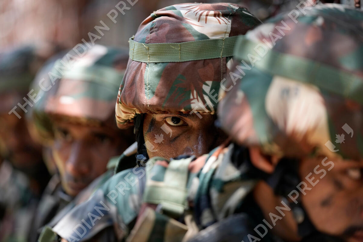 Indian army soldiers display an exercise along the Line of Control or LOC between India and Pakistan during a media tour arranged by the Indian army in Jammu and Kashmir's Poonch sector, India, Saturday, Aug.12, 2023. (AP Photo/Channi Anand)