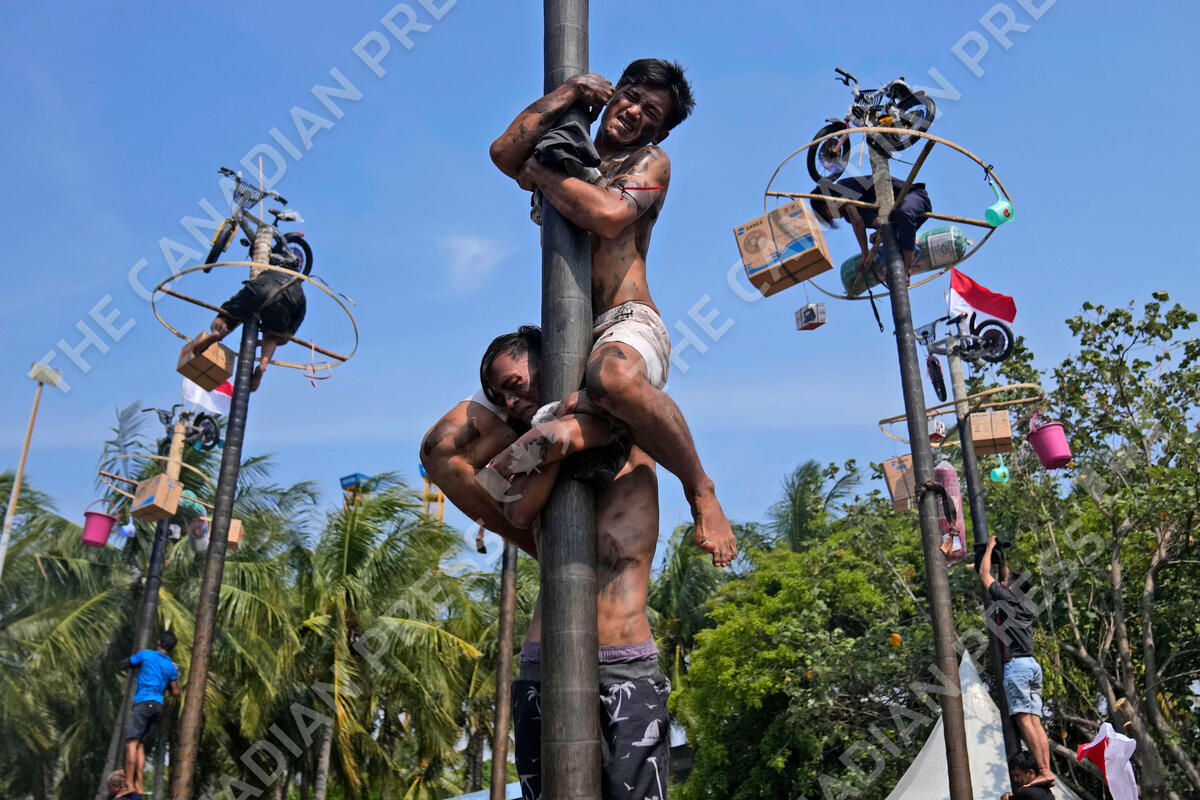 Participants struggle to reach the prizes during a greased-pole climbing competition held as a part of the Independence Day celebrations at Ancol Beach in Jakarta, Indonesia, Thursday, Aug. 17, 2023. Indonesia is celebrating its 78th independence from the Dutch colonial rule. (AP Photo/Dita Alangkara)