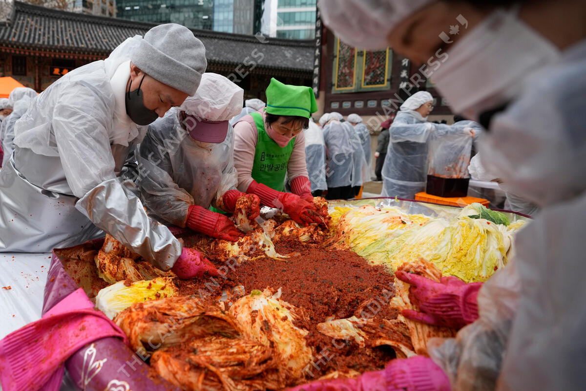 Buddhist monks and Buddhist practitioners make kimchi, a staple Korean side dish, at Jogye temple in Seoul, South Korea, Wednesday, Nov. 29, 2023. They will donate about 3,000 packets of kimchi to needy neighbors in preparation for the winter season. (AP Photo/Lee Jin-man)