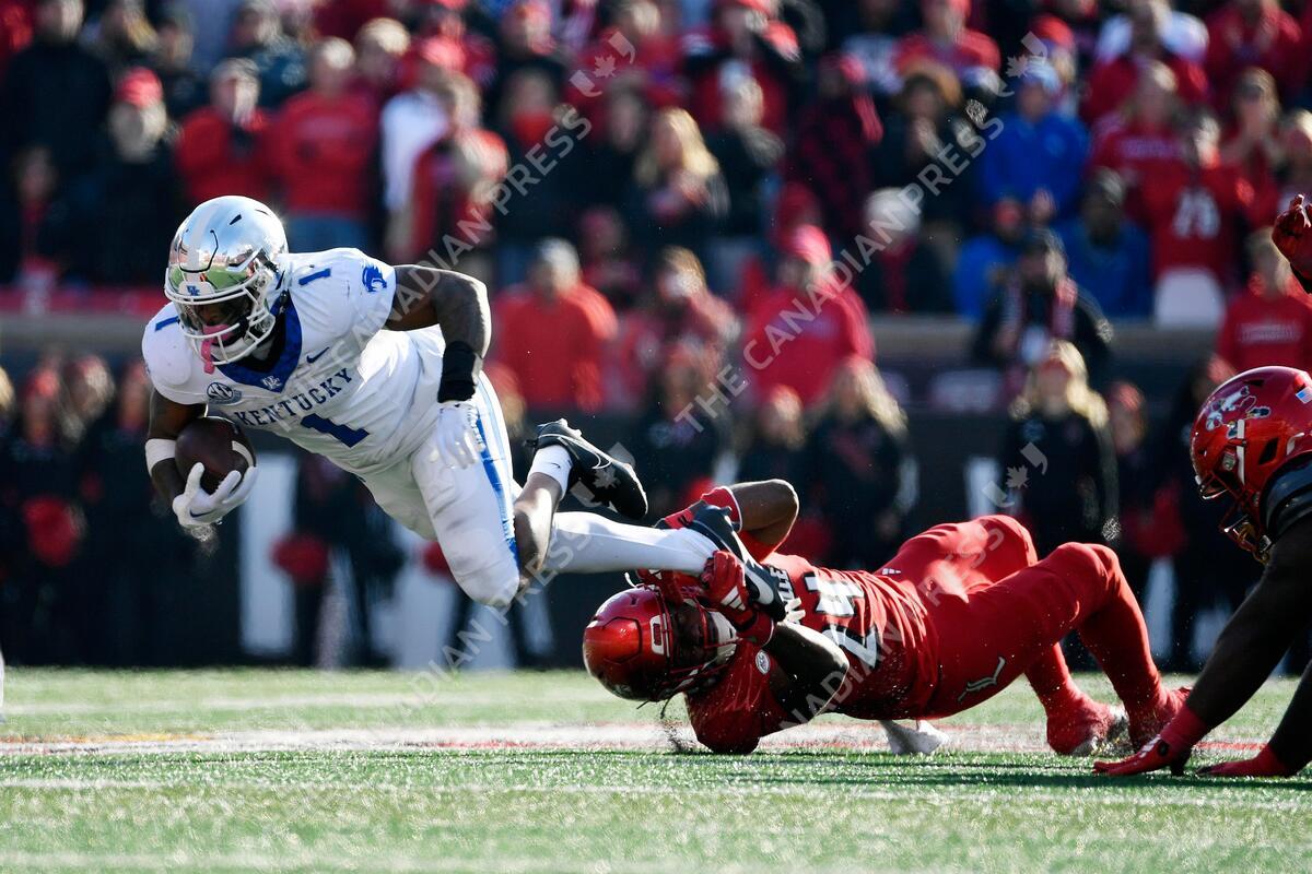 Kentucky running back Ray Davis (1) is brought down by Louisville linebacker Jaylin Alderman (24) during the second half of an NCAA college football game in Louisville, Ky., Saturday, Nov. 25, 2023. (AP Photo/Timothy D. Easley)