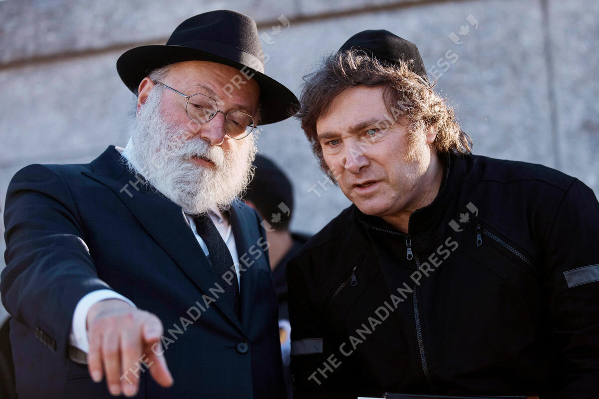 Argentina's President-elect, Javier Milei, second right, visits the Montefiore Cemetery after praying next to Chabad-Lubavitch rabbis at the resting place of the Rebbe, Rabbi Menachem Mendel Schneerson, on Monday, Nov. 27, 2023, in the Queens borough of New York. (AP Photo/Andres Kudacki)