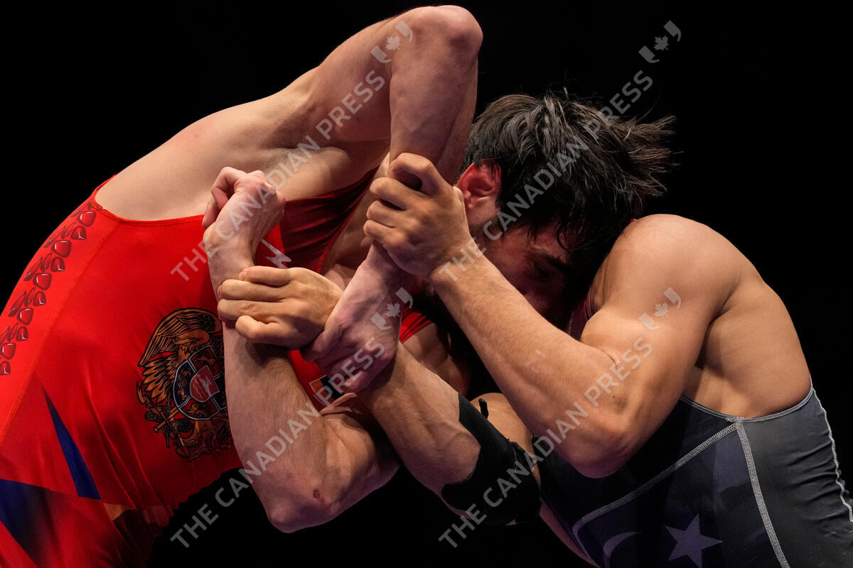 Turkey's Murat Firat, right, competes against Armenia's Slavik Galstyan in a men's Greco-Roman, 67 kg category bronze medal wrestling match during the European Wrestling Championships, in Bucharest, Romania, Wednesday, Feb. 14, 2024. (AP Photo/Andreea Alexandru)