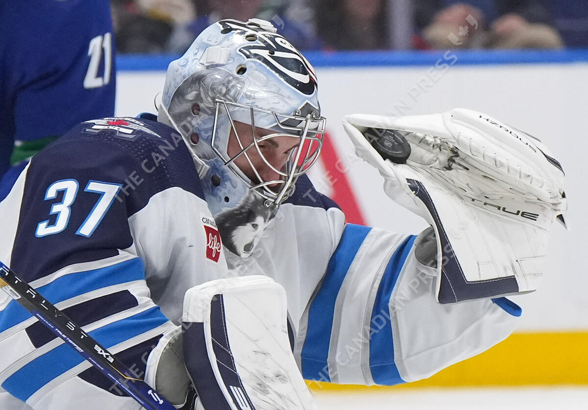 Winnipeg Jets goalie Connor Hellebuyck makes a glove save during the third period of an NHL hockey game against the Vancouver Canucks in Vancouver, on Saturday, February 17, 2024. THE CANADIAN PRESS/Darryl Dyck