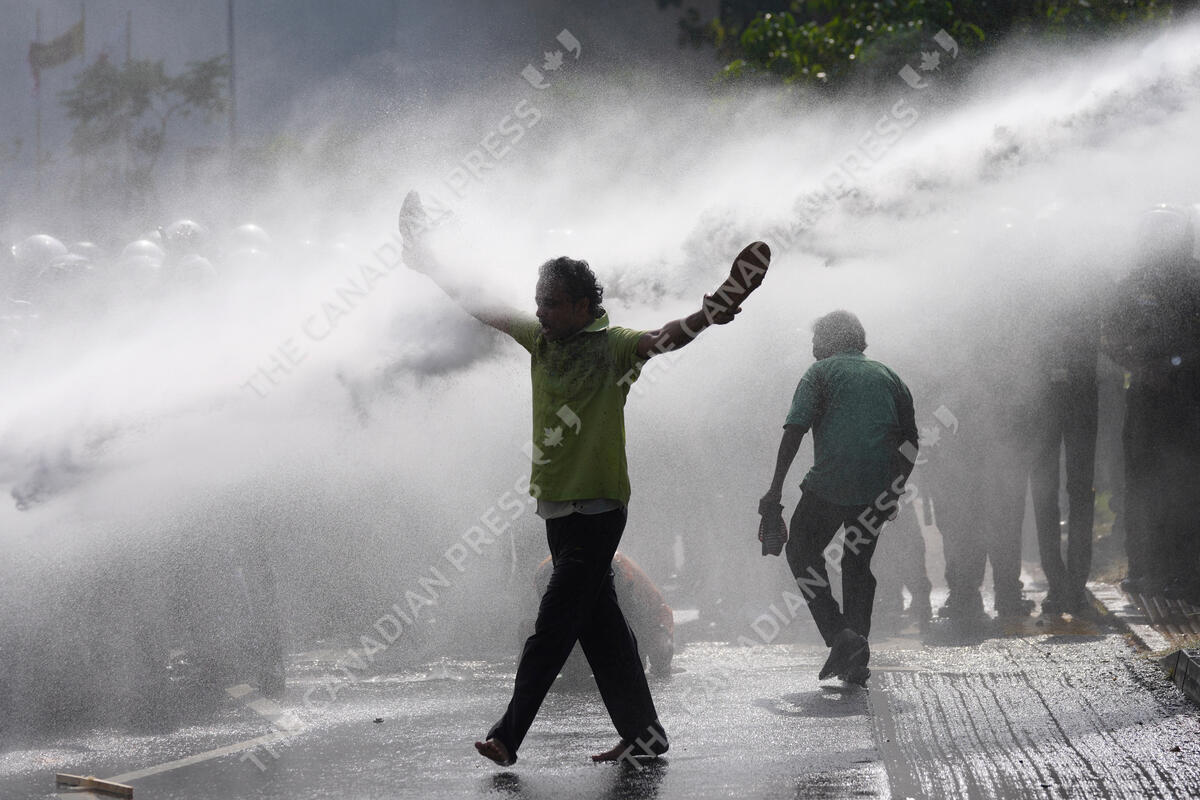 A supporter of Sri Lanka's main opposition holds his shoes in hands as police fire water cannons to disperse them during a protest rally against high taxes and increases in electricity and fuel charges, in Colombo, Sri Lanka, Tuesday, Jan. 30, 2024. (AP Photo/Eranga Jayawardena)