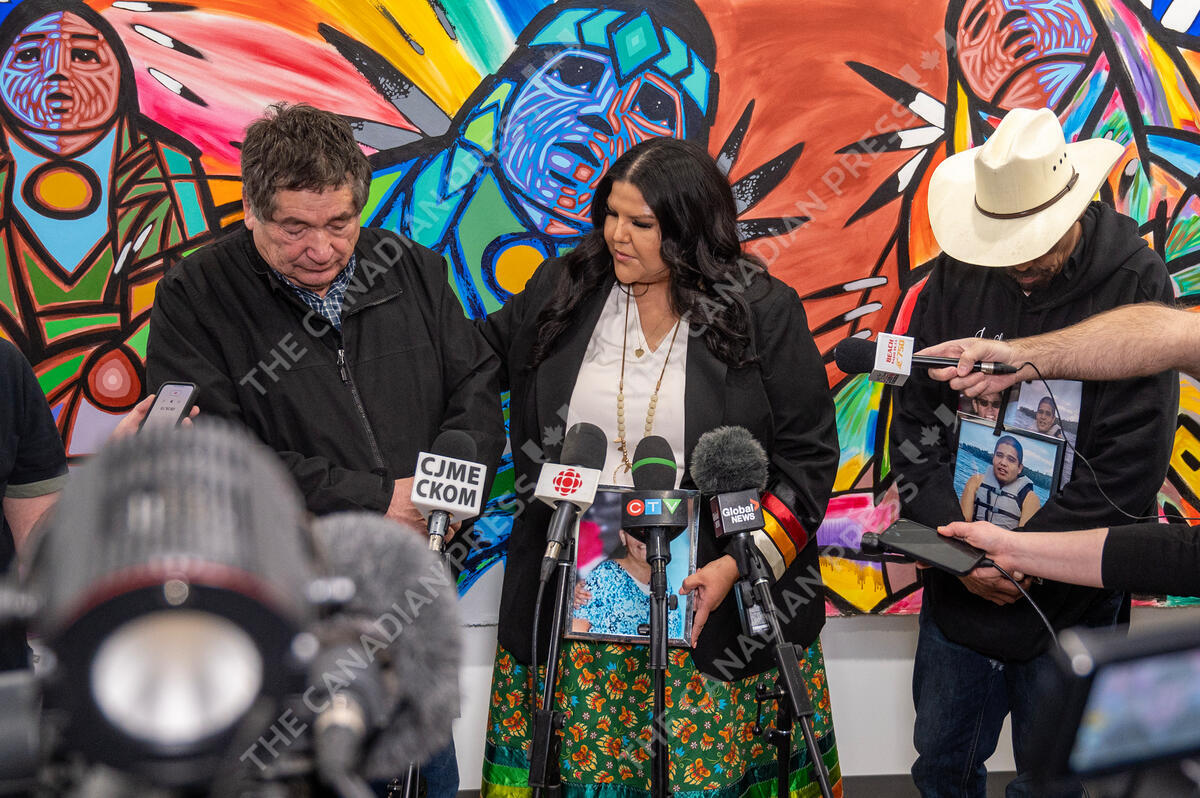 Darryl Burns, left to right, whose sister Gloria was one of the people killed on James Smith Cree Nation, Chelsey Stonestand, a representative of Burns' family, and Brian (Buggy) Burns, who's wife, Bonnie, and son, Gregory, were both killed, speaks to media following the final day of the public coroner's inquest into the mass stabbings that happened on James Smith Cree Nation in 2022 in Melfort, Sask. on Wednesday, January 31, 2024. THE CANADIAN PRESS/Liam Richards
