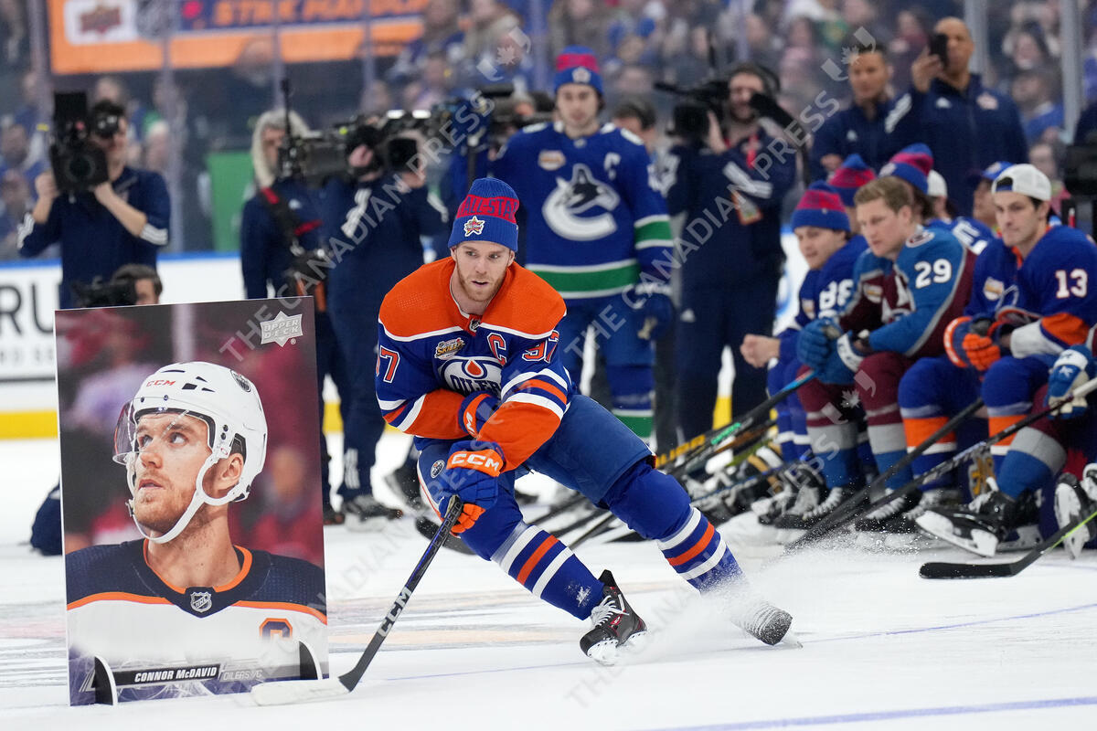 Edmonton Oilers' Connor McDavid navigates the course during the NHL All-Star skills competition's stick handling section, in Toronto, Friday, Feb. 2, 2024. THE CANADIAN PRESS/Nathan Denette