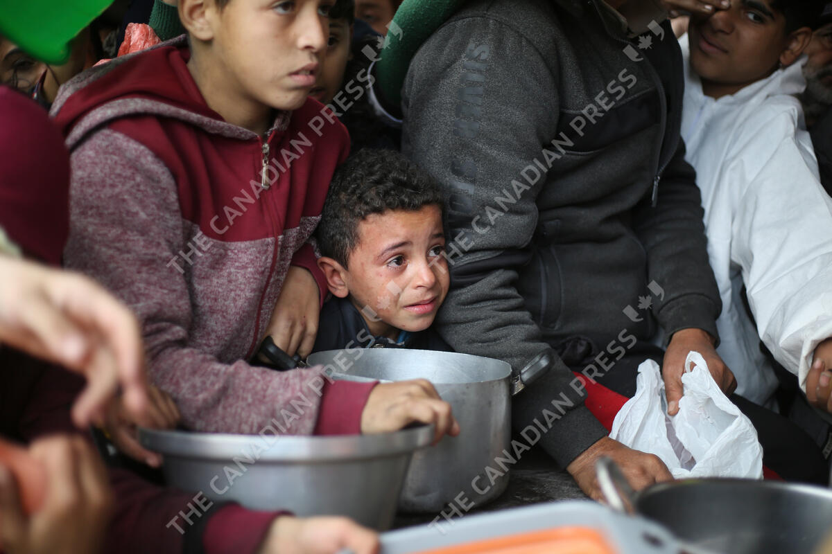 Palestinians line up for free food distribution during the ongoing Israeli air and ground offensive in Khan Younis, Gaza Strip, Friday, Feb. 2, 2024. (AP Photo/Hatem Ali)
