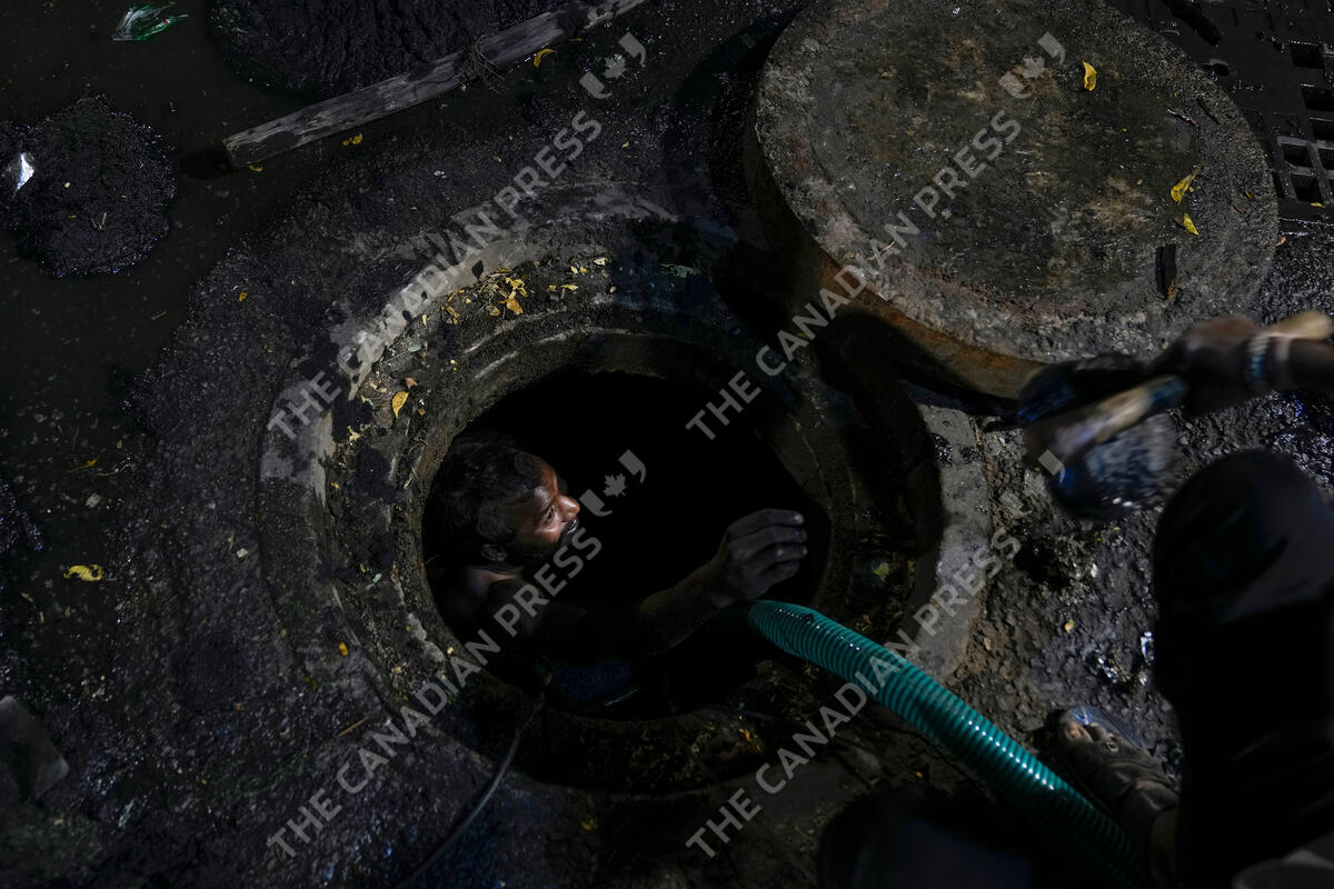 A worker cleans a manhole on a street in Hyderabad, India, Sunday, Jan. 21, 2024. (AP Photo/Mahesh Kumar A.)