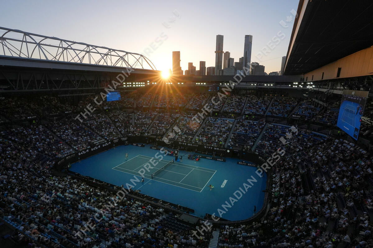 Sunsets over Rod Laver Arena during the quarterfinal match between Zheng Qinwen of China and Anna Kalinskaya of Russia at the Australian Open tennis championships at Melbourne Park, Melbourne, Australia, Wednesday, Jan. 24, 2024. (AP Photo/Andy Wong)