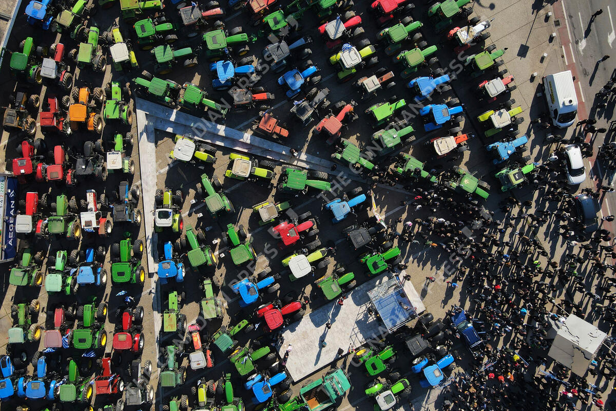 Protesting farmers with their tractors take part in a rally outside an agricultural fair in the port city of Thessaloniki, northern Greece, Thursday, Feb. 1, 2024. Greek farmers – hit by rising costs and crop damage caused by recent floods and wildfires – are threatening to block highways to press demands for tax relief and higher subsidy payments. (AP Photo/Giannis Papanikos)