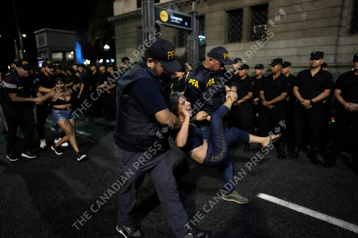 Police detain protesters outside Congress where lawmakers are debating a bill promoted by Argentine President Javier Milei in Buenos Aires, Argentina, Wednesday, Jan. 31, 2024. The bill includes a broad range of economic, administrative, criminal and environmental reforms. (AP Photo/Rodrigo Abd)