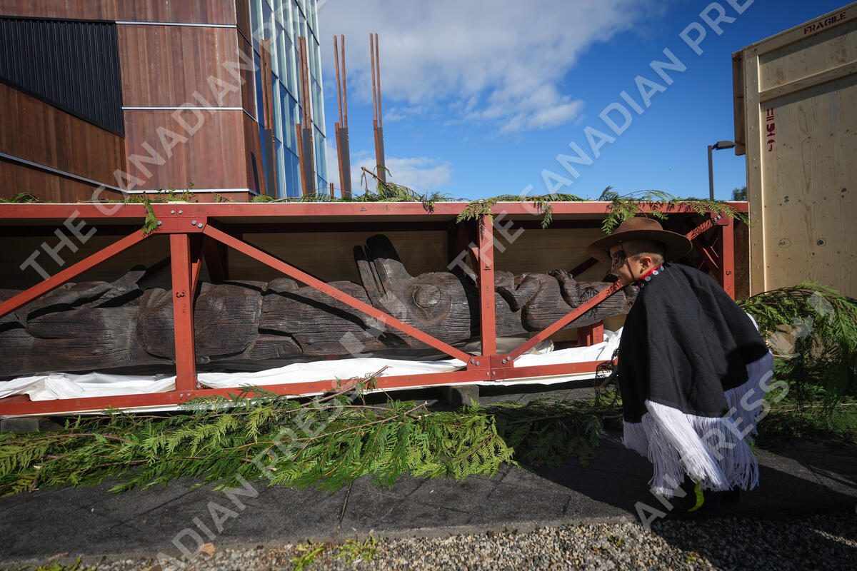 A young boy places protective cedar branches around the House of Ni'isjoohl memorial totem during a homecoming celebration for it at the Nisga'a Nation in Laxgalts'ap, B.C., Friday, Sept. 29, 2023. The totem, on display in the National Museum of Scotland in Edinburgh since 1930, was returned to the Nass Valley, which is about 1,400 kilometres northwest of Vancouver, after a journey that included a flight aboard a Canadian Armed Forces aircraft. THE CANADIAN PRESS/Darryl Dyck