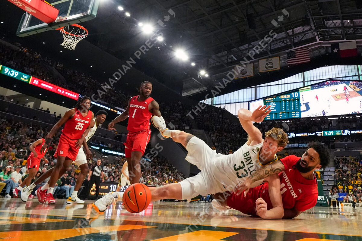 Baylor forward Caleb Lohner (33) battles for a loose ball with Houston guard Jamal Shead (11) during the first half of an NCAA college basketball game, Saturday, Feb. 24, 2024 in Waco, Texas. (AP Photo/Julio Cortez)