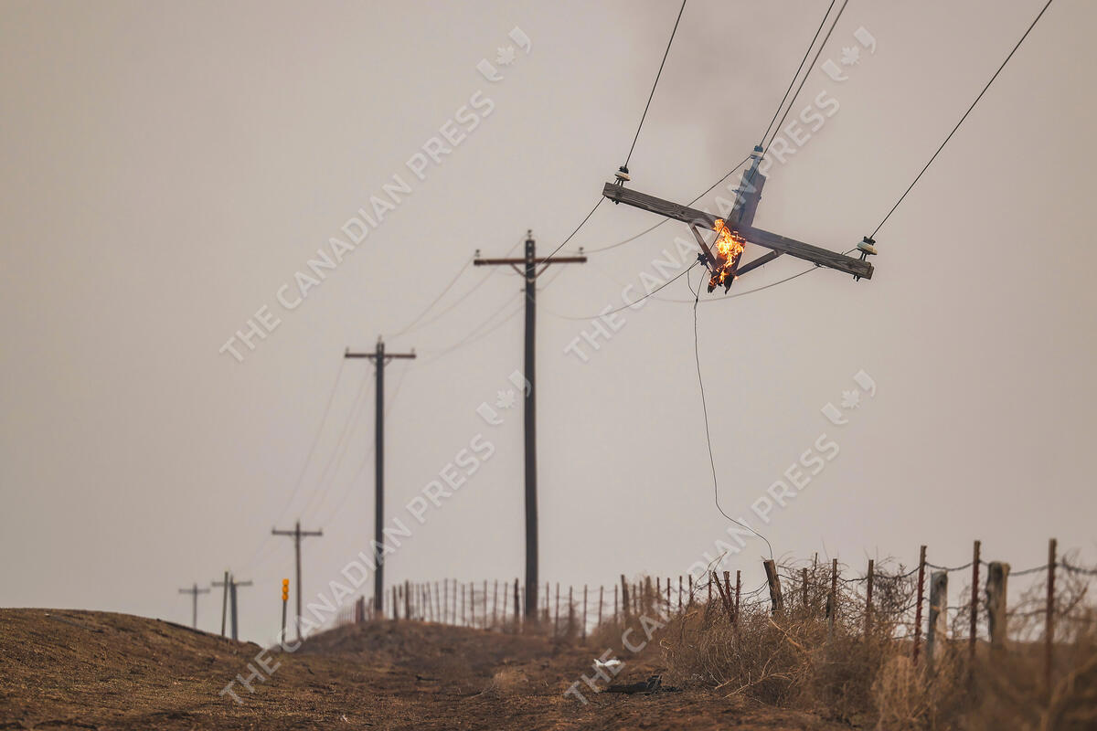 Part of a telephone pole is suspended as it burns from the Smokehouse Creek Fire, Wednesday, Feb. 28, 2024, in Canadian, Texas. (AP Photo/David Erickson)