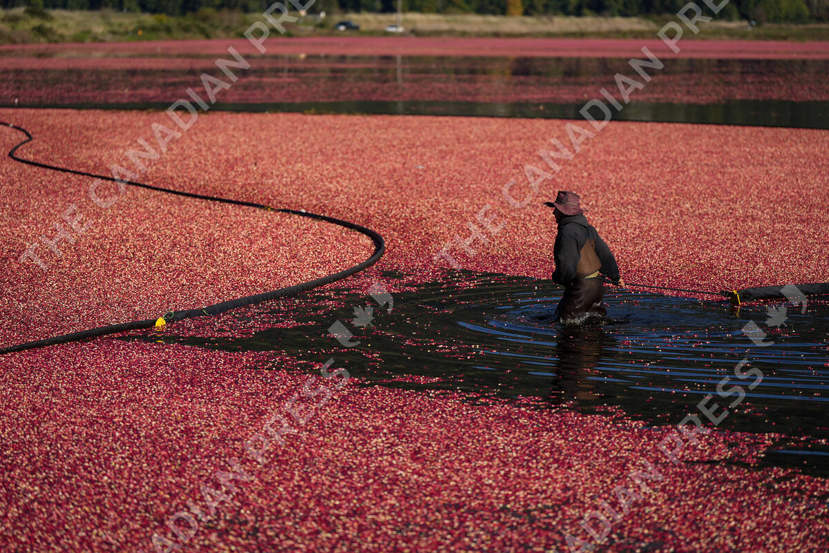A worker pulls a boom while harvesting cranberries at Golden Eagle Farms, in Pitt Meadows, B.C., on Thursday, October 12, 2023. Machines are used to beat the cranberries off vines and then the bog is flooded with water. Air pockets in the fruit cause the berries to float to the surface and then workers use booms to corral them before they are pumped into transport trailers and delivered to Ocean Spray for processing. THE CANADIAN PRESS/Darryl Dyck