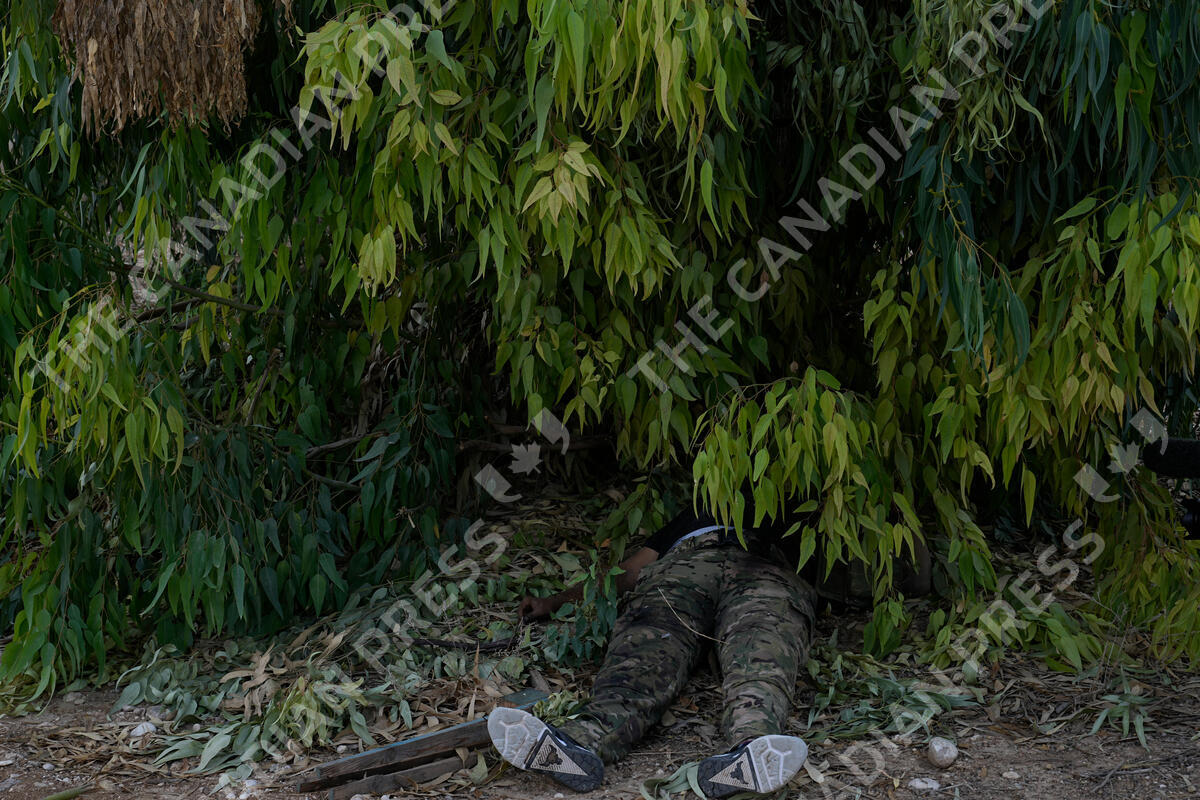 The body of a Hamas militant lies on the ground in kibbutz Kfar Azza on Tuesday, Oct. 10, 2023. Hamas militants overran Kfar Azza on Saturday, where many Israelis were killed and taken captive. (AP Photo/Ohad Zwigenberg)