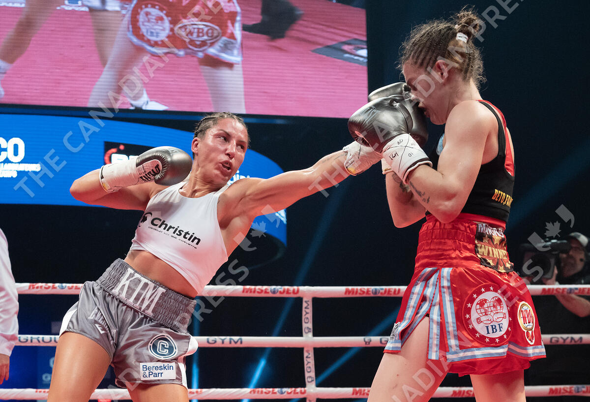 Kim Clavel, left, and Evelin Bermudez battle for the IBF WBO World Light Flyweight boxing title in Laval, Quebec on Saturday October 7, 2023.